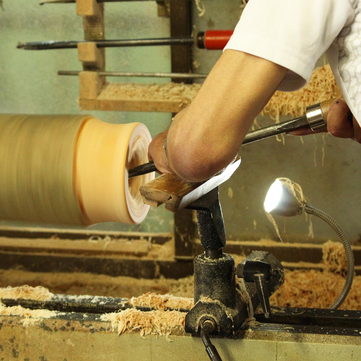 一つ一つ、磨かれたタンブラーは表面もなめらかで肌触りもよく手によくなじむように作られている。タンブラーの木の種類は椿とヤマモモが選べる。椿は淡いクリーム色。ヤマモモは濃い茶色に仕上がる。